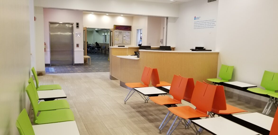 East New York Community Healthcare Center, developed by Housing Works in 1998, offers congregate supportive housing for adults with lived experience of homelessness in 32 furnished studio apartments, with rooftop solar panels and an on-site health clinic. Residents have access to Primary Care, Behavioral Health, Pharmacy, and outpatient substance use treatment through OASAS. The building has undergone several renovations, including converting the cellar into clinic space and installing solar panels in 2019.