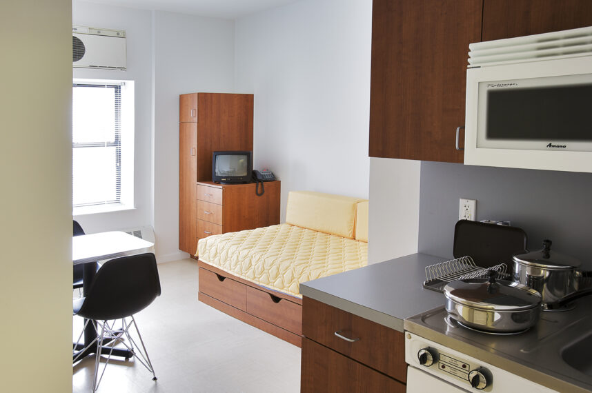 Renovated in 2009, Lexington Avenue is a four-story congregate supportive housing site in Bedford-Stuyvesant offering 20 furnished studio apartments for homeless single adults. Operated as short-term housing, it provides stays of 6–12 months with on-site case management and access to health, employment, and housing services. Amenities include washers and dryers on every floor, a community room, and a shared backyard.